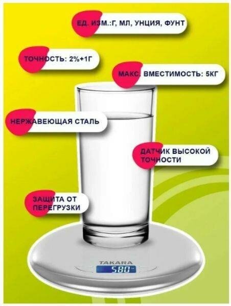 Type: electronic, design: platform, weighing limit: 5 kg, measurement accuracy: 1 g, additional functions: liquid volume measurement, design features: removable platform/bowl, indication: battery charge