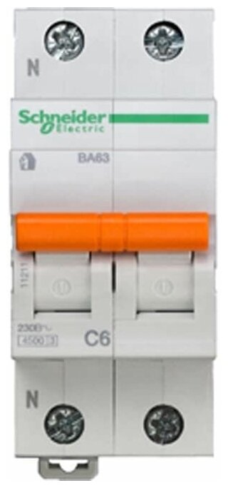Automatic modular 2P 1P+N C 6A 4.5kA BA63 Brownie Schneider Electric 11211, 1pc