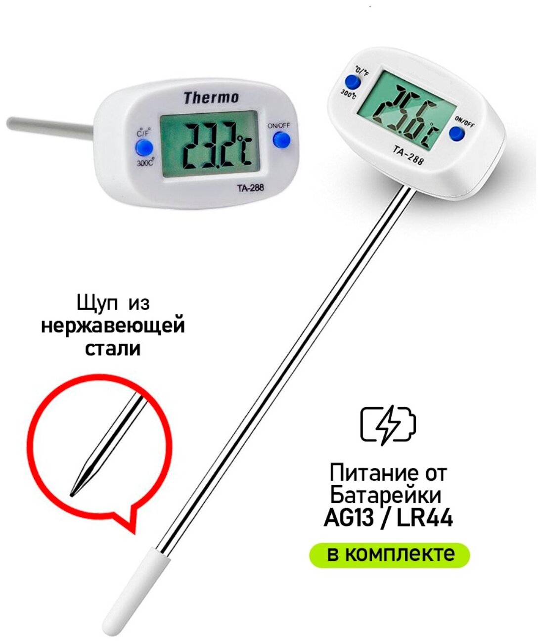 Test duration: 10 seconds; probe length - 13.5 cm; power supply: 1 AG13 element included, weight 70 g
