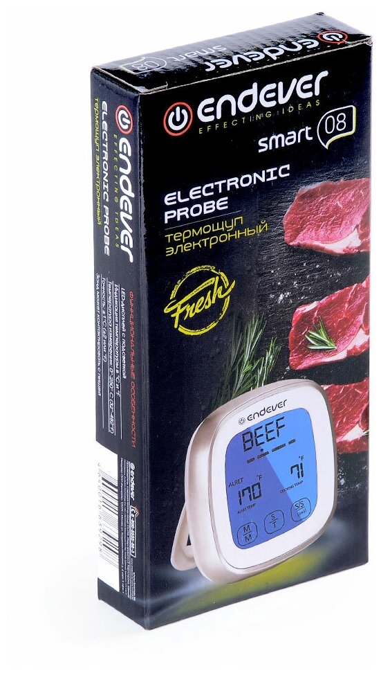 Batteries are not included; probe length - 19 cm; temperature display in °C and °F, Accuracy: ±1 °С ±2 or °F; Ready sound signal; on a magnet: no; Battery size: AAA