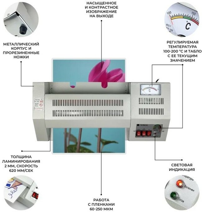 Laminator type: batch, lamination method: hot, cold, maximum format: A4, max. material thickness: 2 mm, power consumption: 635 W, heating time: 2 min., features: reverse, temperature adjustment, foul