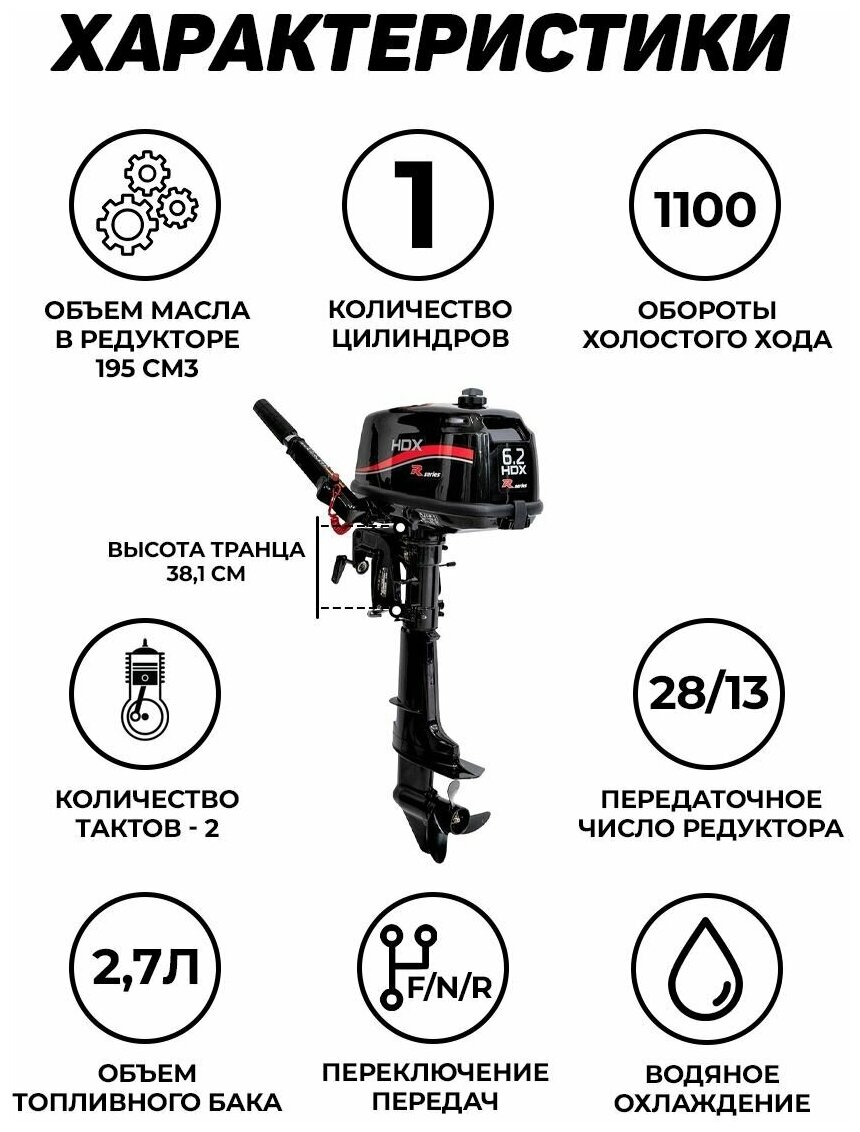 Type: Outboard motor, power: 6.20 HP, power: 4563 W, features: shallow water travel, electronic ignition system, control: tiller, transom height: S, weight: 21 kg
