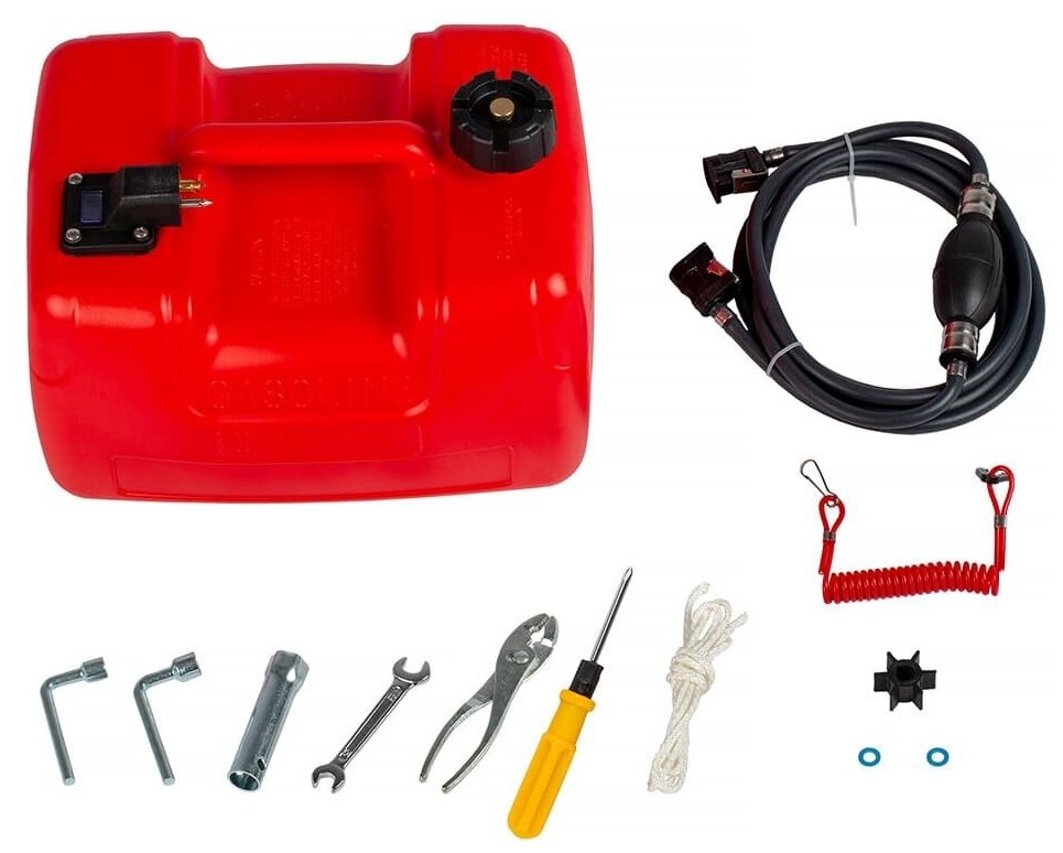 Boat motor, 12 liter tank, propeller, tool kit, emergency pin, fuel hose, spare impeller, spare ignition cord.