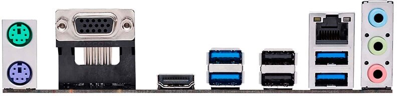 DisplayPort, HDMI, LAN RJ-45, PS/2 keyboard/mouse, USB 2.0 Type-A x 2, USB 3.2 Gen1 Type-A x 4