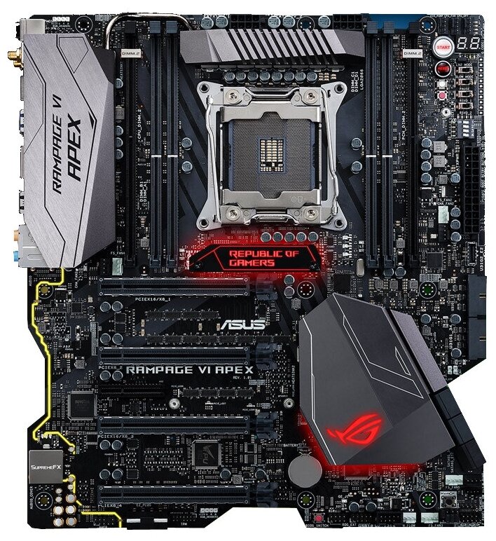 Socket: LGA2066, chipset name: Intel X299, form factor: EATX, processor manufacturer: Intel, memory type: DDR4 DIMM, number of memory slots: 6, number of M.2 slots: 4, number of PCI-E x16 slots: 4, wireless interfaces: Bluetooth, Wi-Fi 802.11ac, m