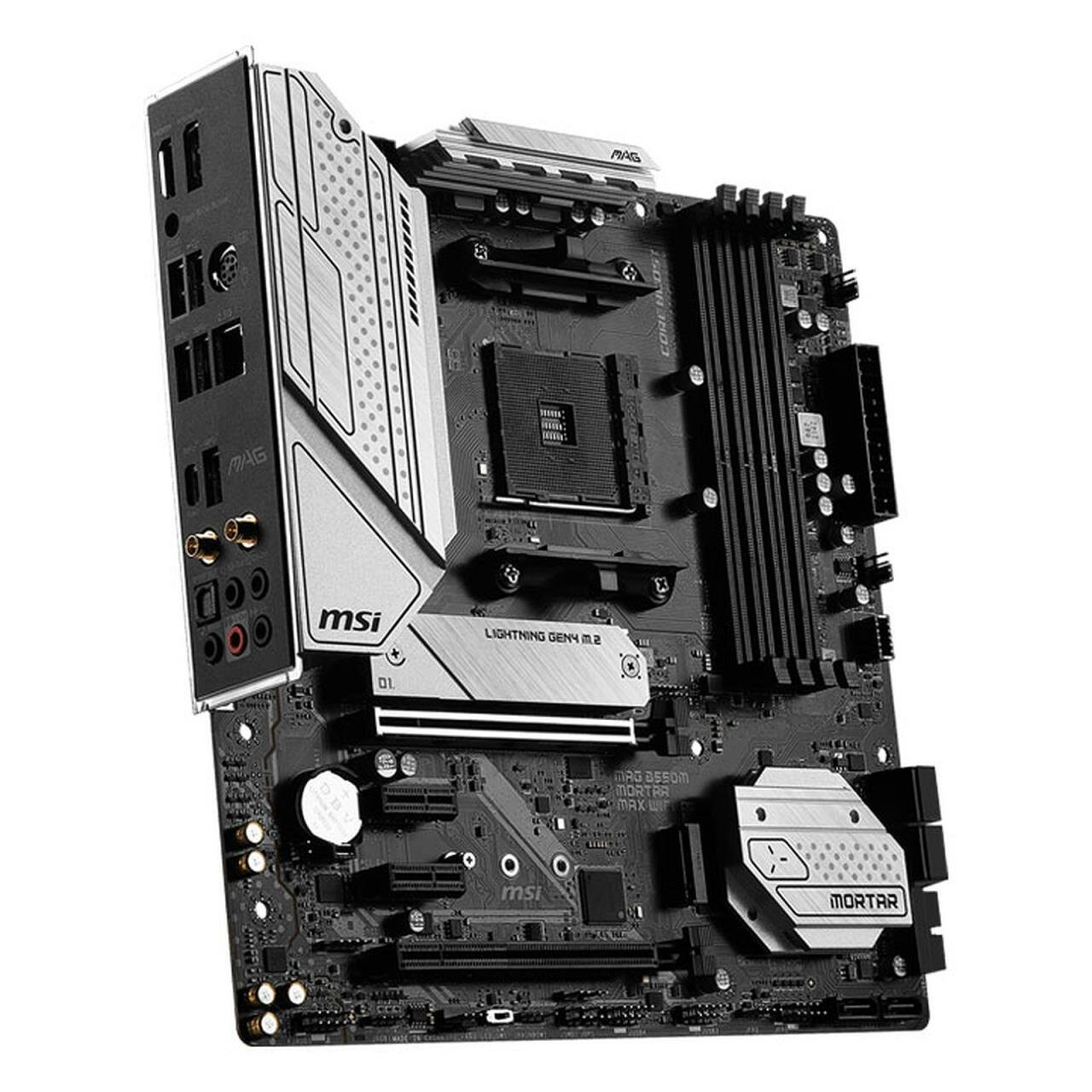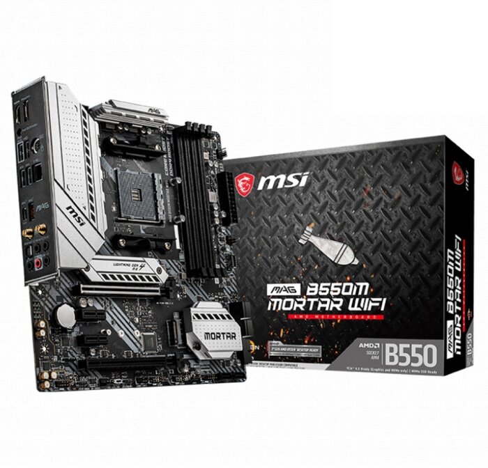 Socket: AM4, chipset name: AMD B550, form factor: microATX, processor manufacturer: AMD, memory type: DDR4 DIMM, number of memory slots: 4, number of M.2 slots: 2, number of PCI-E x16 slots: 1, Number of PCI-E x1 slots: 2, wireless
