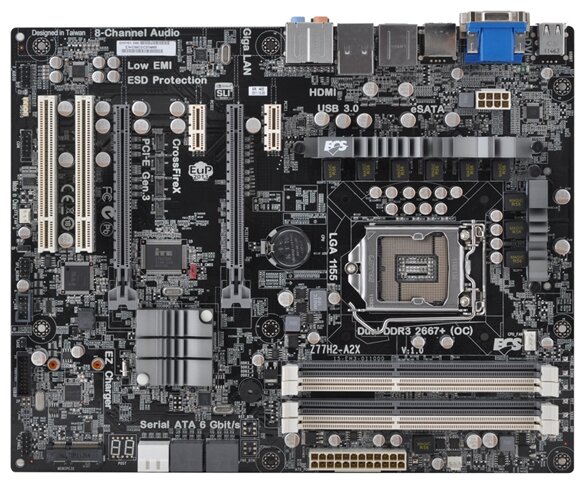 Socket: LGA1155, chipset name: Intel Z77, form factor: ATX, processor manufacturer: Intel, memory type: DDR3 DIMM, number of memory slots: 4, number of PCI-E x16 slots: 2, number of PCI-E x1 slots: 2 , wireless interfaces: no Wi-Fi, max