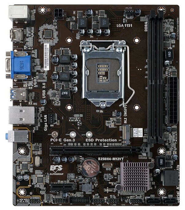 Socket: LGA1151, chipset name: Intel B250, form factor: microATX, processor manufacturer: Intel, memory type: DDR4 DIMM, number of memory slots: 2, number of M.2 slots: 1, number of PCI-E x16 slots: 1, Number of PCI-E x1 slots: 1, wireless