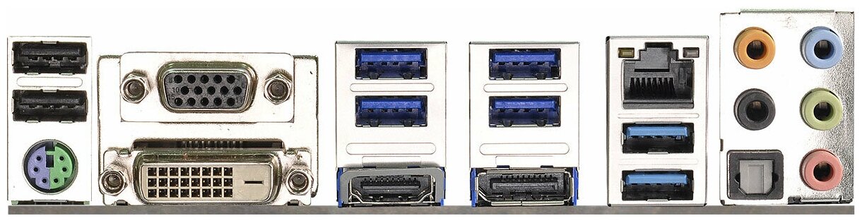 DVI, DisplayPort, HDMI, PS/2 keyboard/mouse, USB 3.0 x 6, VGA, S/PDIF optical output