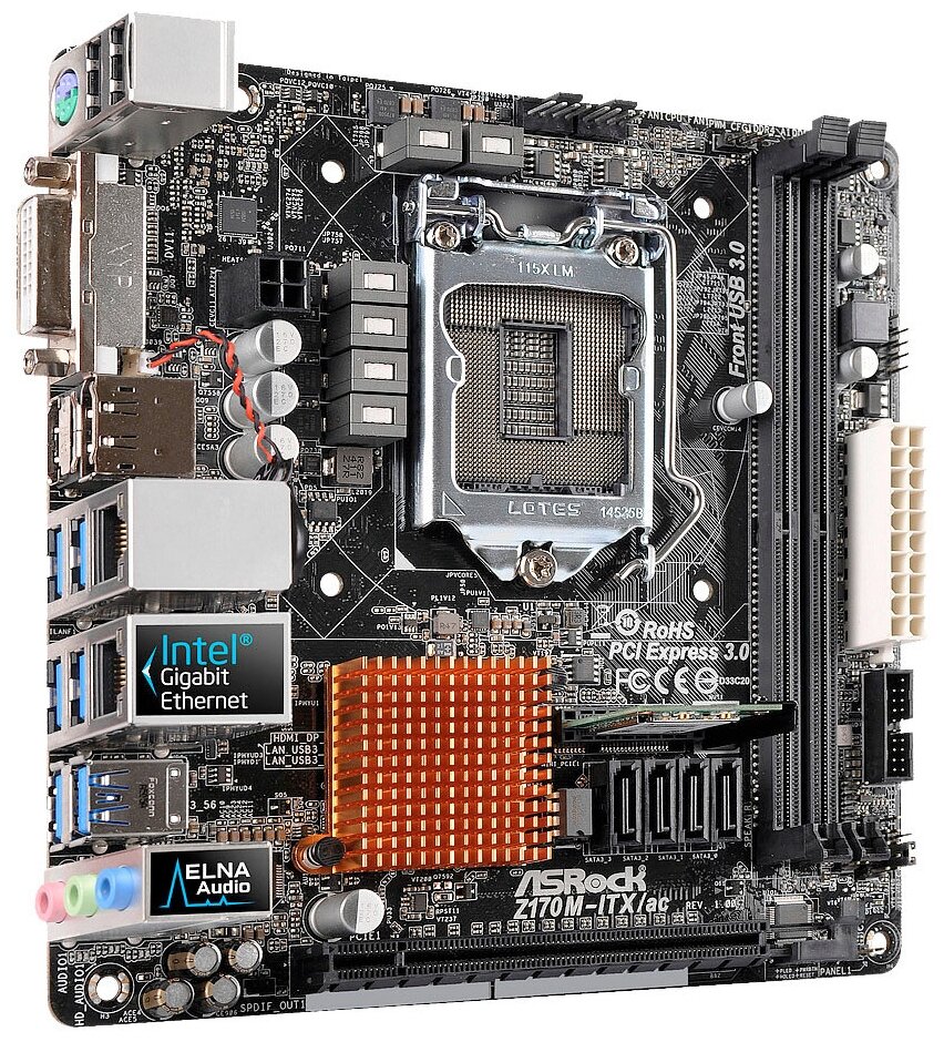 Socket: LGA1151, chipset name: Intel Z170, form factor: mini-ITX, processor manufacturer: Intel, memory type: DDR4 DIMM, number of memory slots: 2, number of PCI-E x16 slots: 1, wireless interfaces: Bluetooth, Wi -Fi 802.11ac, maximum frequency