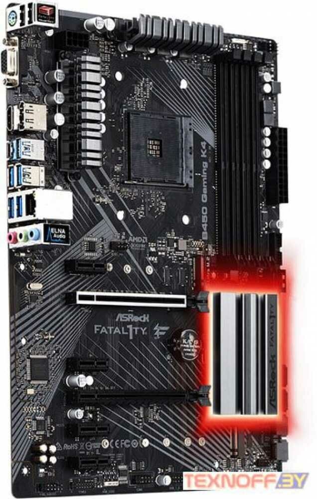 Socket: AM4, chipset name: AMD B450, form factor: ATX, processor manufacturer: AMD, memory type: DDR4 DIMM, ECC/non-ECC support, number of memory slots: 4, number of M.2 slots: 2, number of slots PCI-E x16: 2, Number of PCI-E x1 slots: 4, no