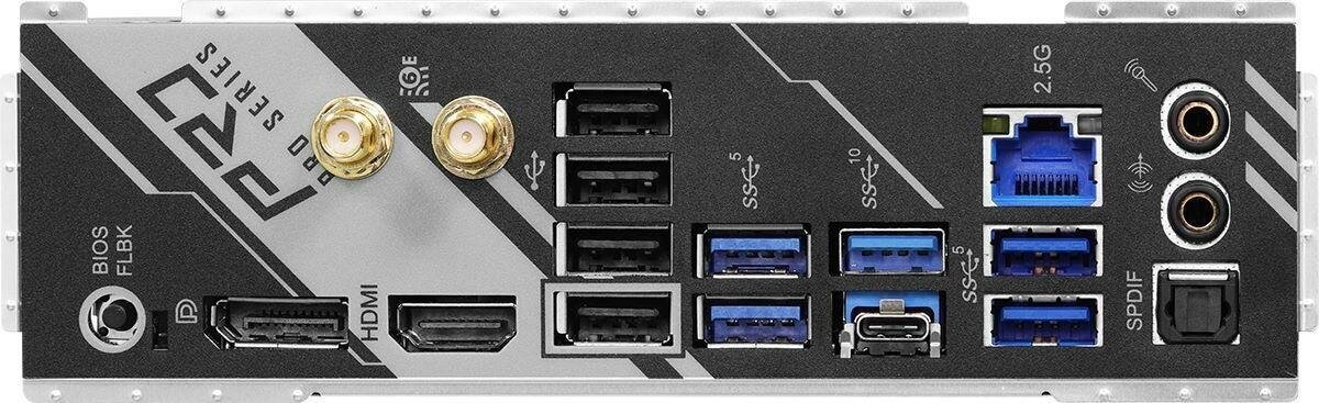 DisplayPort, HDMI, LAN RJ-45, SMA for Wi-Fi antenna x 2, USB 2.0 Type-A x 4, USB 3.2 Gen1 Type-A x 4, USB 3.2 Gen2 Type-A, USB 3.2 Gen2 Type-C, output S/PDIF optical