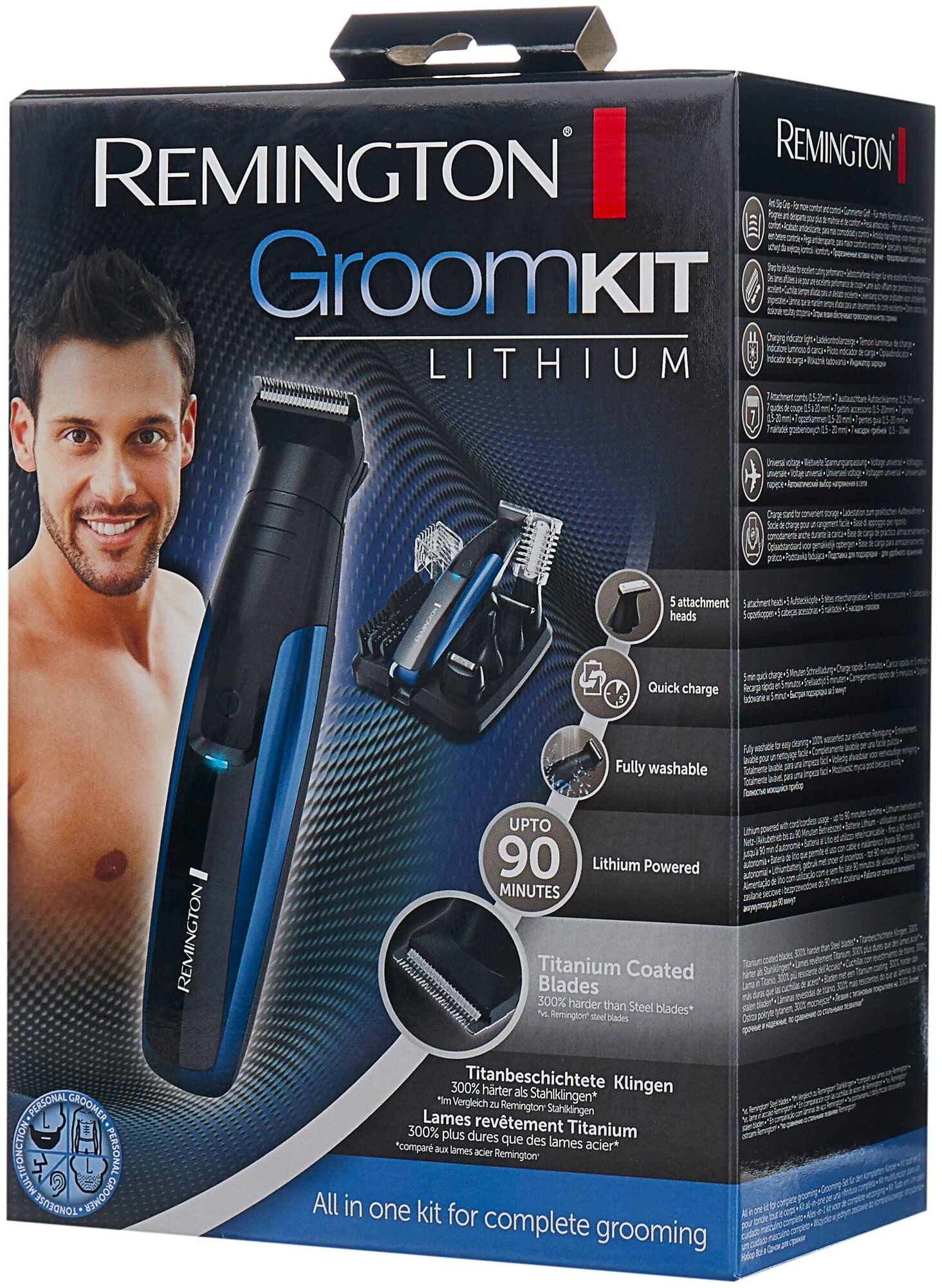 Fast charging 5 minutes; wide trimmer; nose and ear trimmer; mini razor; detailed trimmer; body trimmer; 5 non-adjustable nozzles: 1.5, 3, 6, 9, 12mm; nozzle with length adjustment 2-20mm