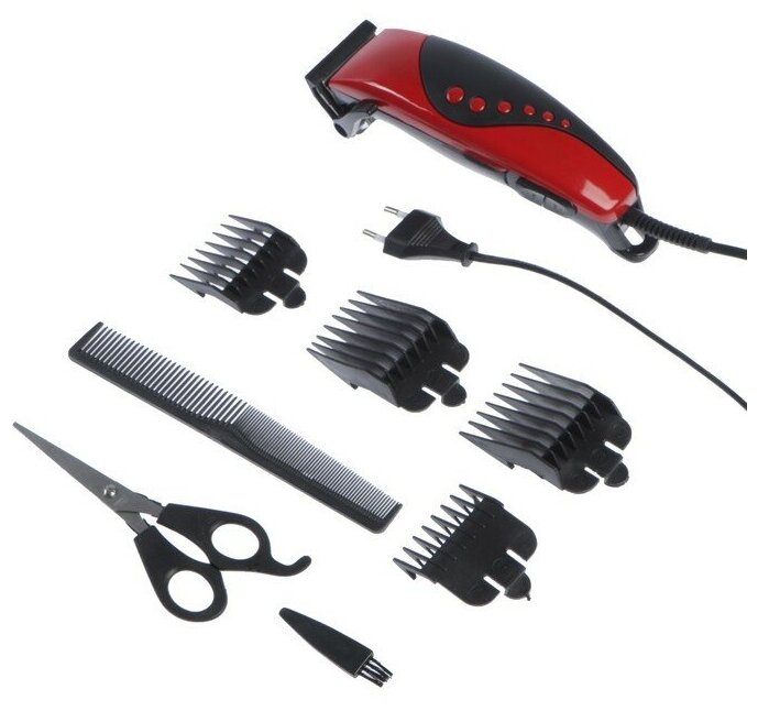Purpose: for hair cutting, type: hair clipper, power supply: mains, minimum cutting length: 3 mm, maximum cutting length: 12 mm, length adjustment method: changing attachments, included: scissors, number of attachments: 4