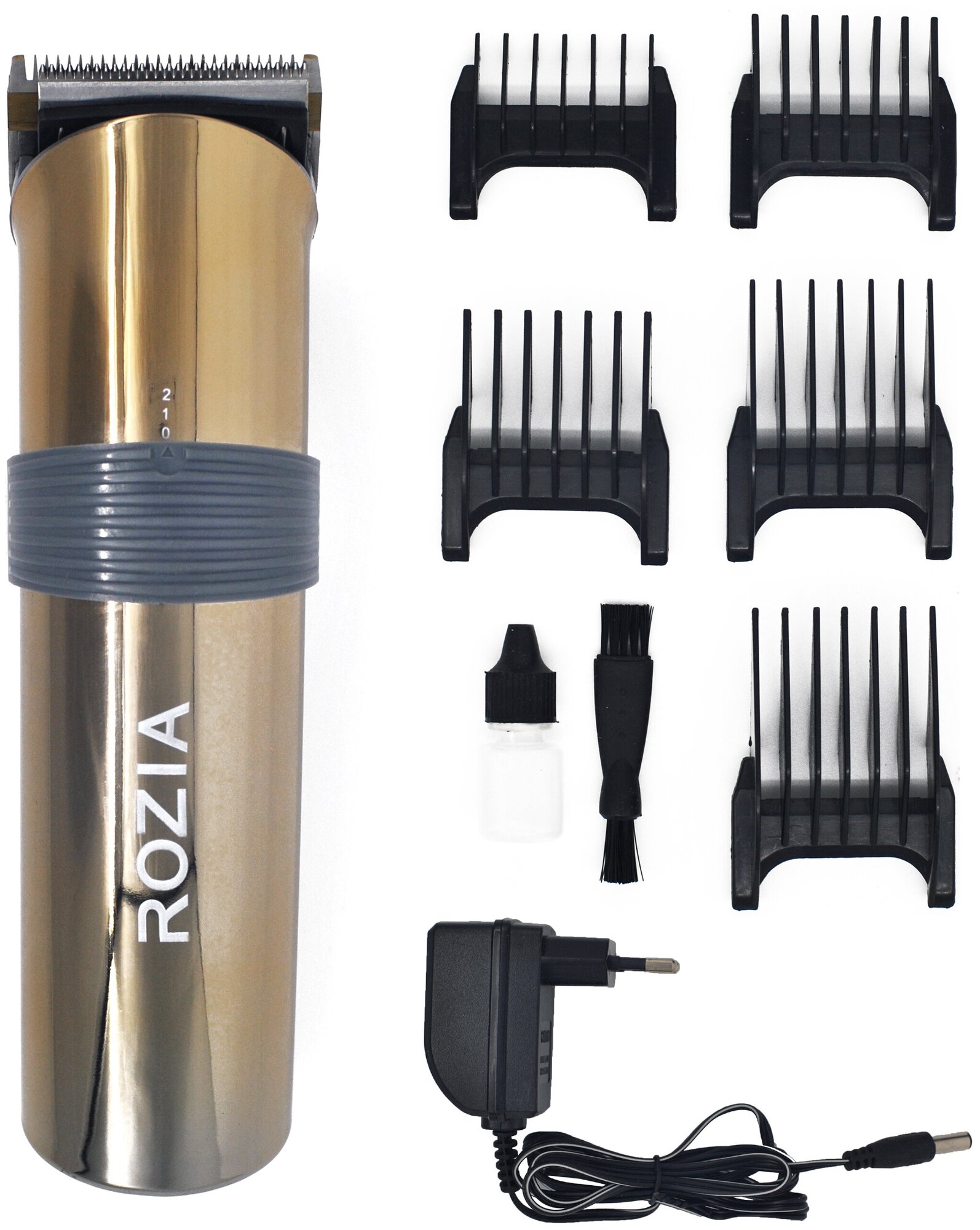 Oil, brush, 5 attachments, charging station, charging cable, trimmer