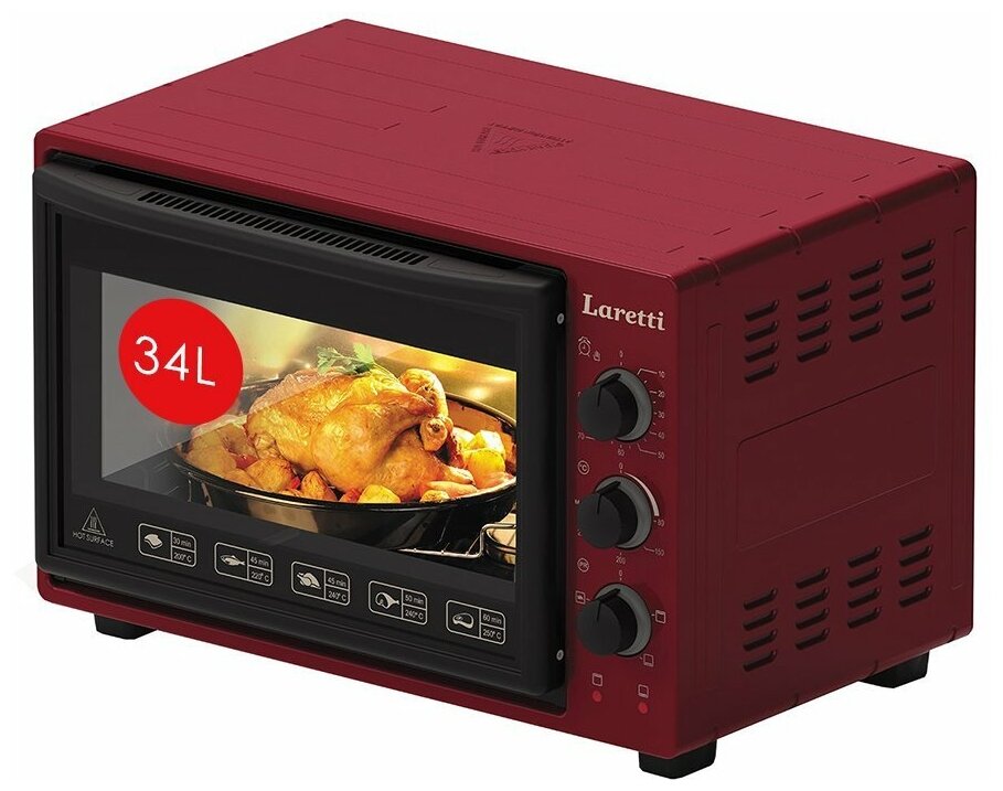 Modes: top heating, top+bottom heating, bottom heating, chamber volume: 34 l, features: timer, control: mechanical, equipment: spit, round baking sheet, baking sheet, wire rack, width: 50 cm, depth: 32.80 cm, height