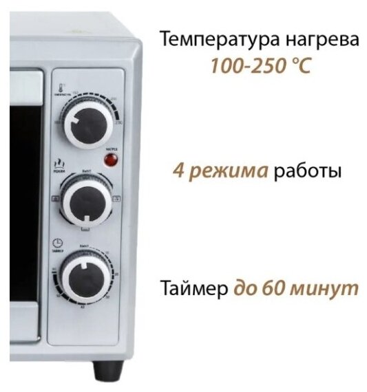 Modes: top heating, top+bottom heating, bottom heating, Grill, chamber volume: 36 l, features: internal lighting, mechanical control, timer, control: mechanical, equipment: spit, baking sheet, sieve