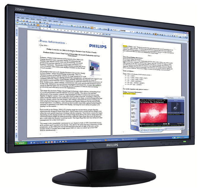 Diagonal details: 22 ", max. resolution: 1680x1050, response time: 5 ms, aspect ratio: 16:10, brightness: 300 cd/m2, features: built-in speakers, height adjustment, video interfaces: DVI-D input, input VGA, screen coating: ANT