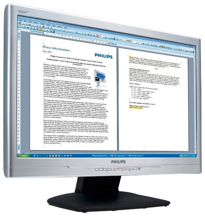 Diagonal detail: 22 ", screen matrix type: TN, max. resolution: 1680x1050, response time: 5 ms, aspect ratio: 16:10, brightness: 300 cd/m2, video interfaces: DVI-D input, VGA input, mount for bracket