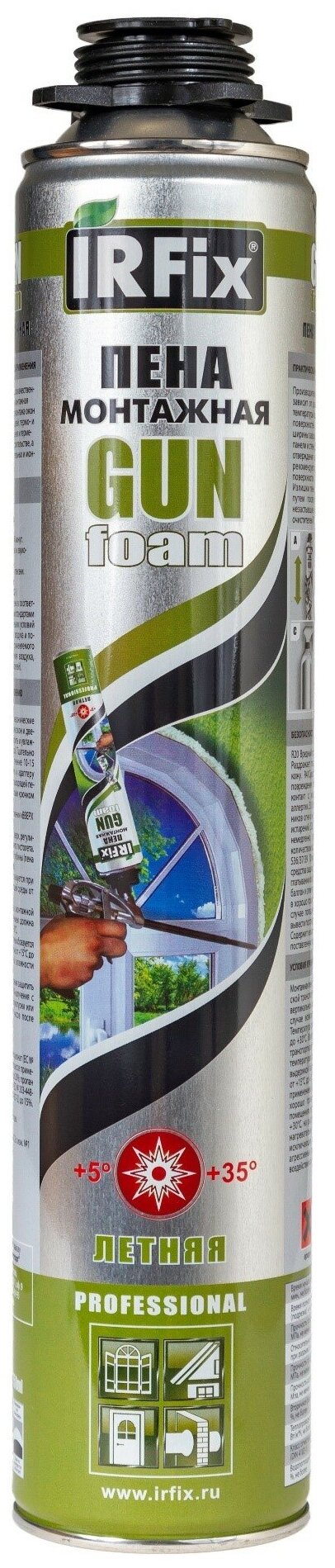 Type: polyurethane foam, volume: 750 ml, seasonality: summer, method of release from the cylinder: gun, features: , fastening to the gun: thread, area of application: universal, drying time: 24 hours, flammability class: B3