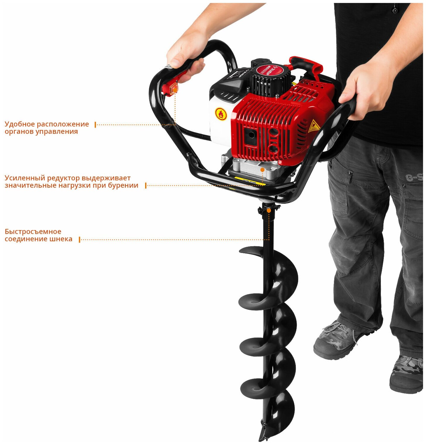 Power: 1.80 kW, engine power: 2.45 hp, connection diameter: 20 mm, minimum drill diameter: 60 mm, maximum drill diameter: 200 mm, drilling surface: soil, ice, weight: 9.50 kg