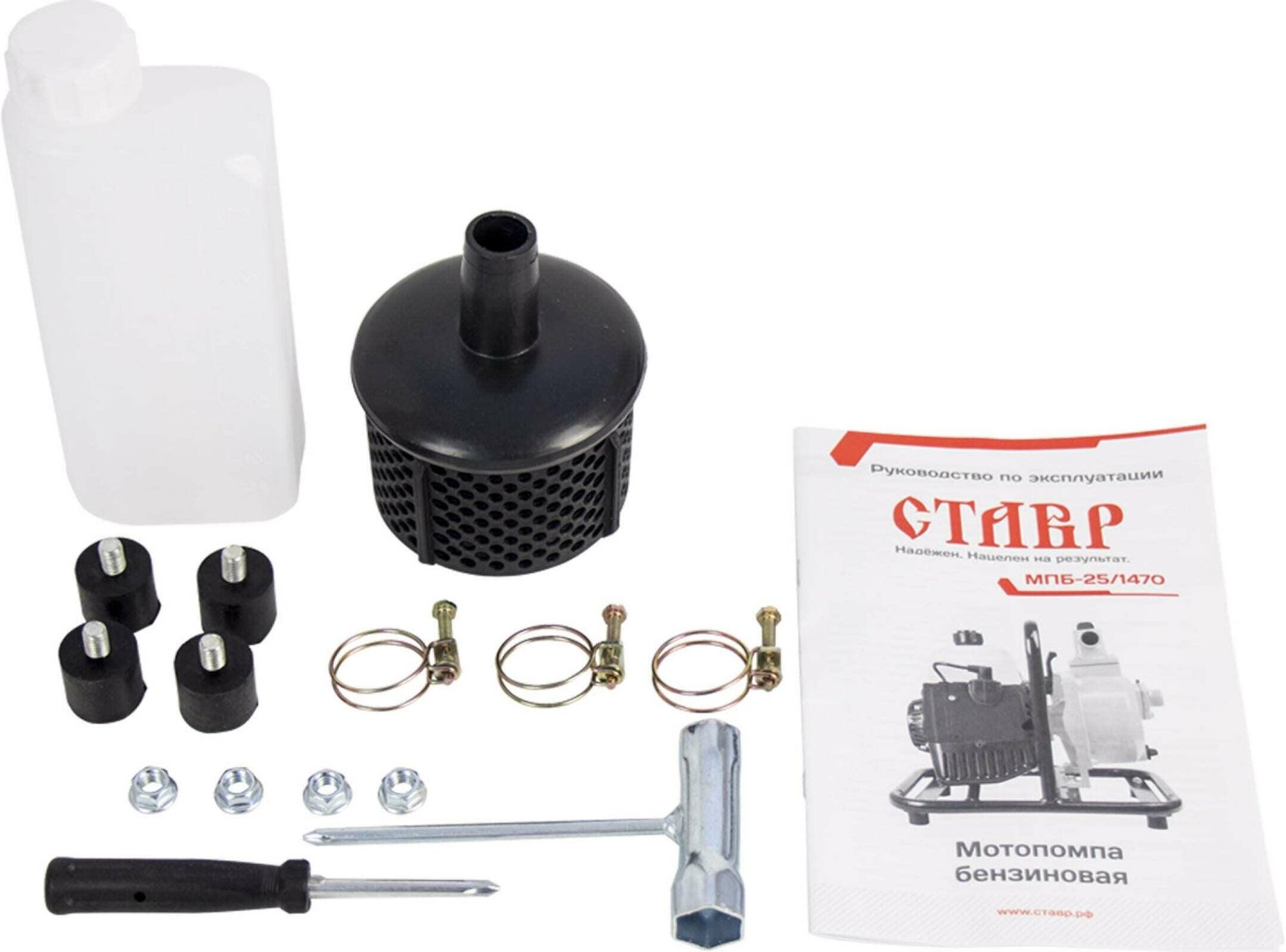 Connecting pipe - 2 pcs., pipe nut - 2 pcs., clamp - 3 pcs., gasket - 2 pcs., spark plug wrench, filter, knives with fastening - 4 pcs., screwdriver, mixing container