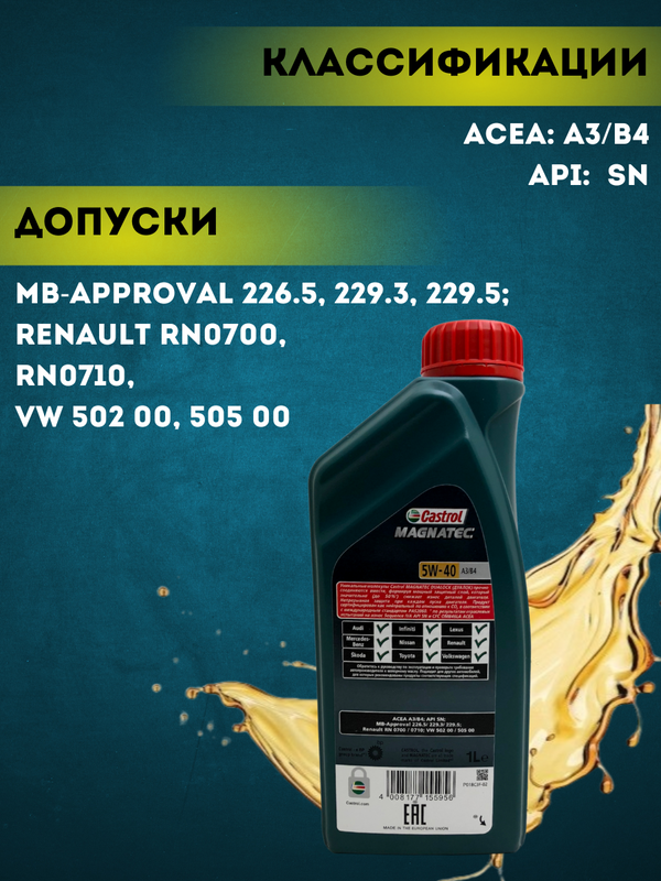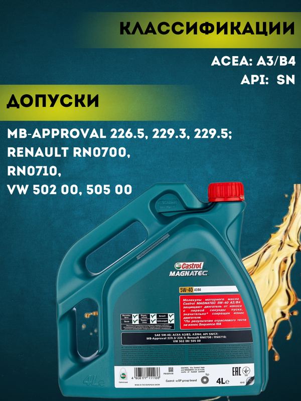 OEM Approvals: BMW Longlife-01, Ford WSS-M2C 917-A, GM Dexos 2, MB 226.5, MB 229.3, MB 229.31, MB 229.5, PORSCHE A40, Renault RN 0700, Renault RN 0710, VW 502.00, VW 502.00/505.00, VW 505.00 , RN 0700, RN 0710, VW 502 00, VW 505 00