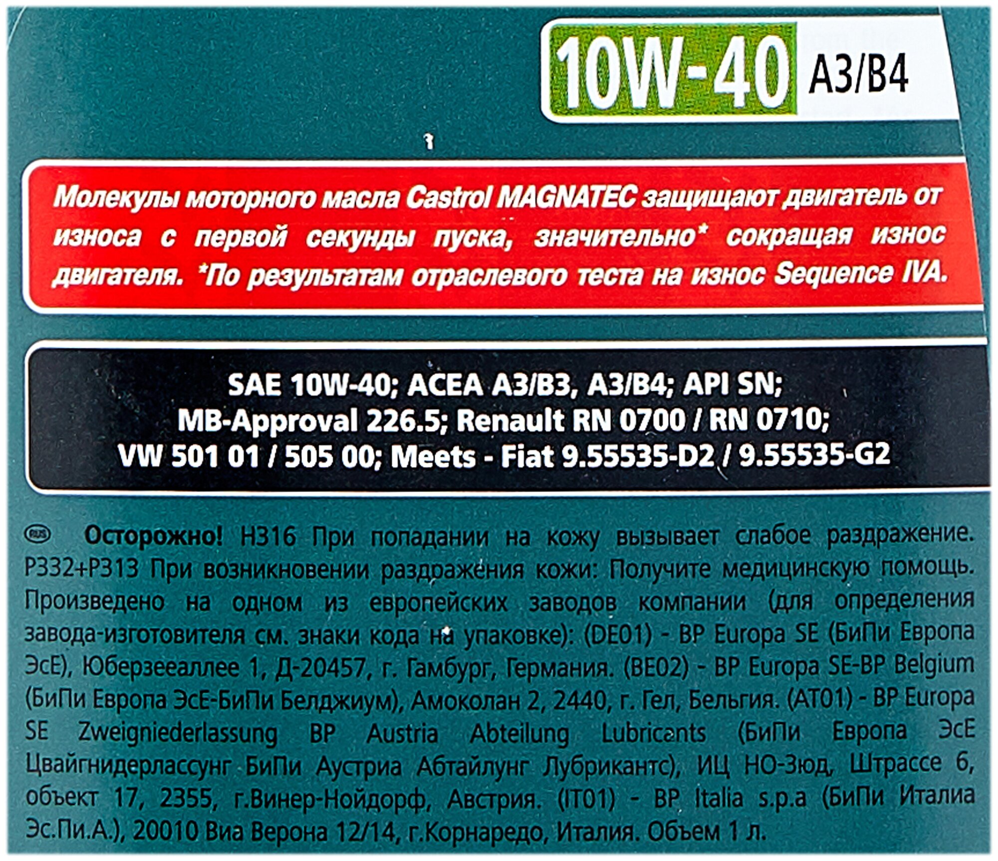 Description: SAE viscosity grade: 10W-40, oil type: semi-synthetic, synthetic, semi-synthetic, original motor oil, fuel type: gasoline, diesel, API standard: SN, ACEA standard: A3/B4, A3/B3, A3, A3/B3, A3/B4, B3, B4, OEM approvals: FIAT 9.55535-D2, MB 226.5