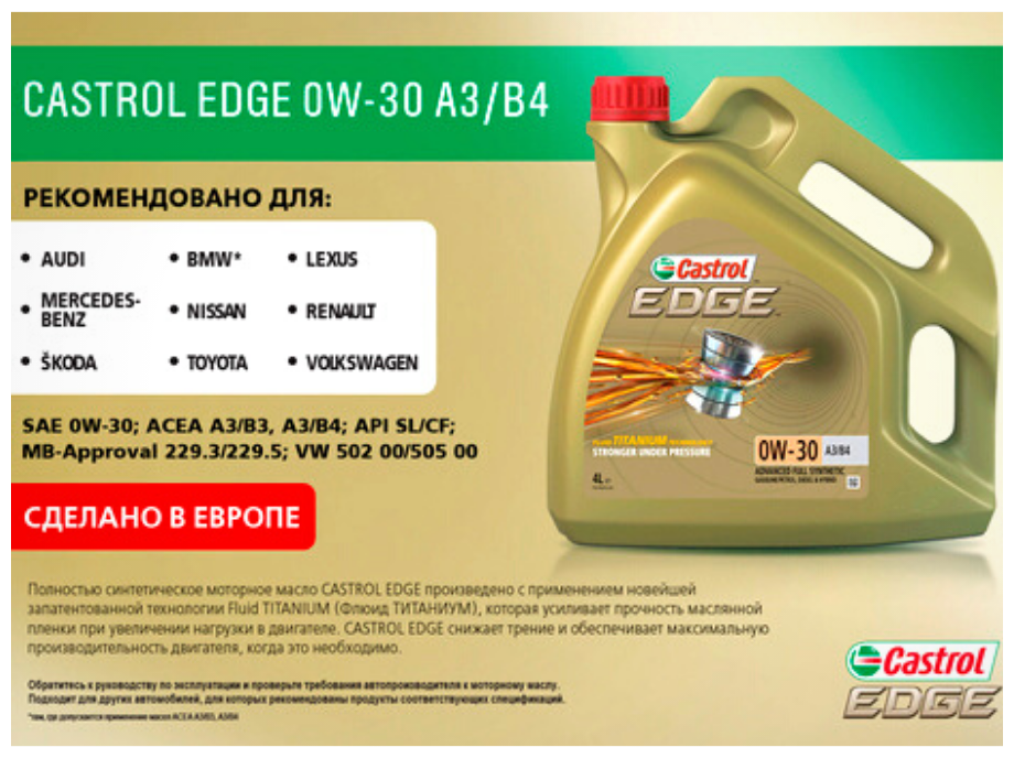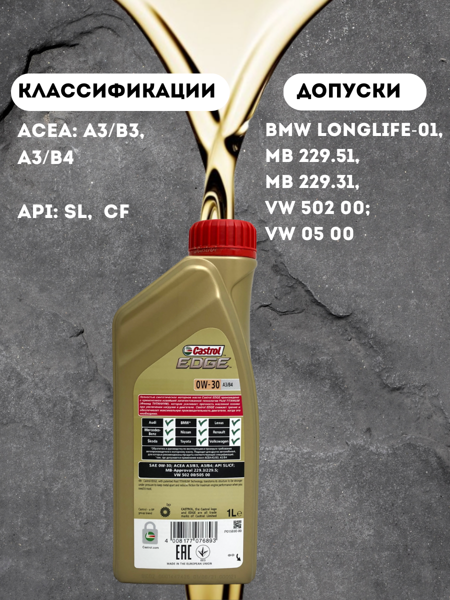 Description: SAE viscosity grade: 0W-30, oil type: semi-synthetic, synthetic, vehicle type: passenger cars, fuel type: gasoline, diesel, API standard: CF, SL, ACEA standard: A3/B4, A3/B3, A3, B3, B4, OEM approvals: BMW Longlife-01, MB 228.31, MB 228.51, MB 229.3, MB 2