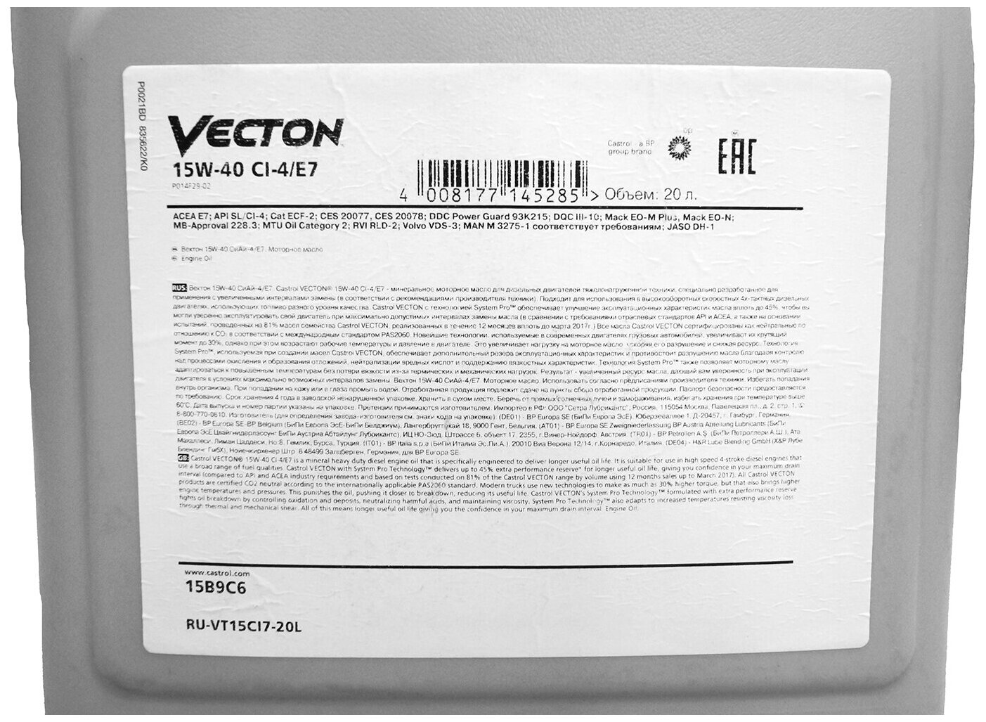 SAE viscosity grade: 15W-40, oil type: mineral, synthetic, vehicle type: trucks and special equipment, fuel type: diesel, API standard: CI-4, ACEA standard: E7, engine type: four-stroke