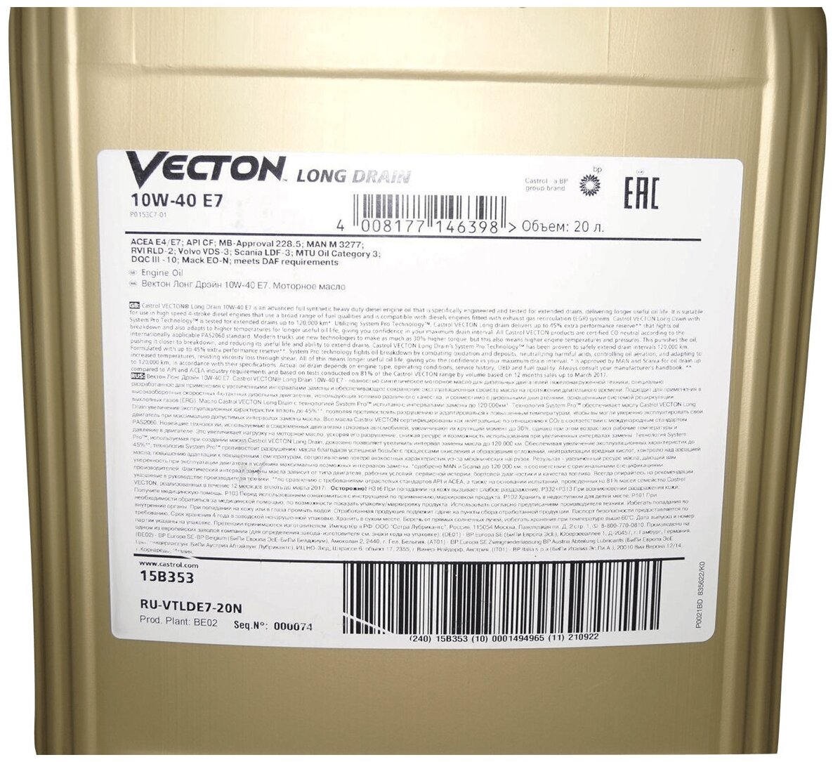 SAE viscosity grade: 10W-40, oil type: semi-synthetic, synthetic, vehicle type: trucks and special equipment, fuel type: diesel, ACEA standard: E4, E7, engine type: four-stroke