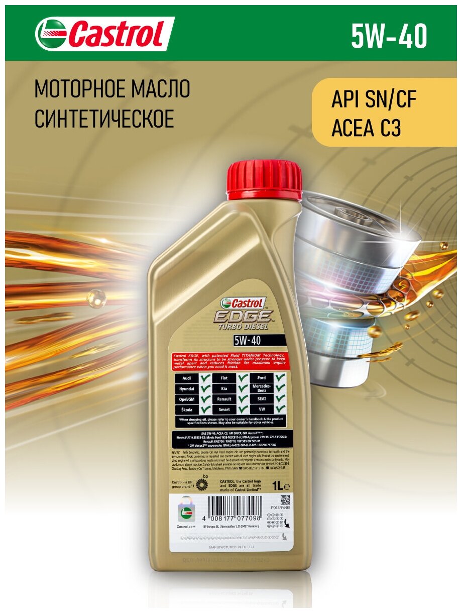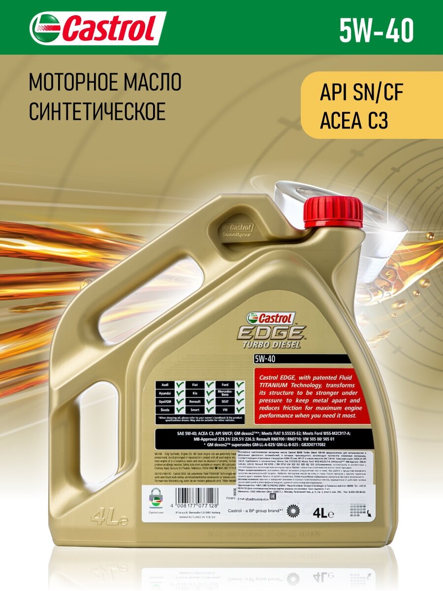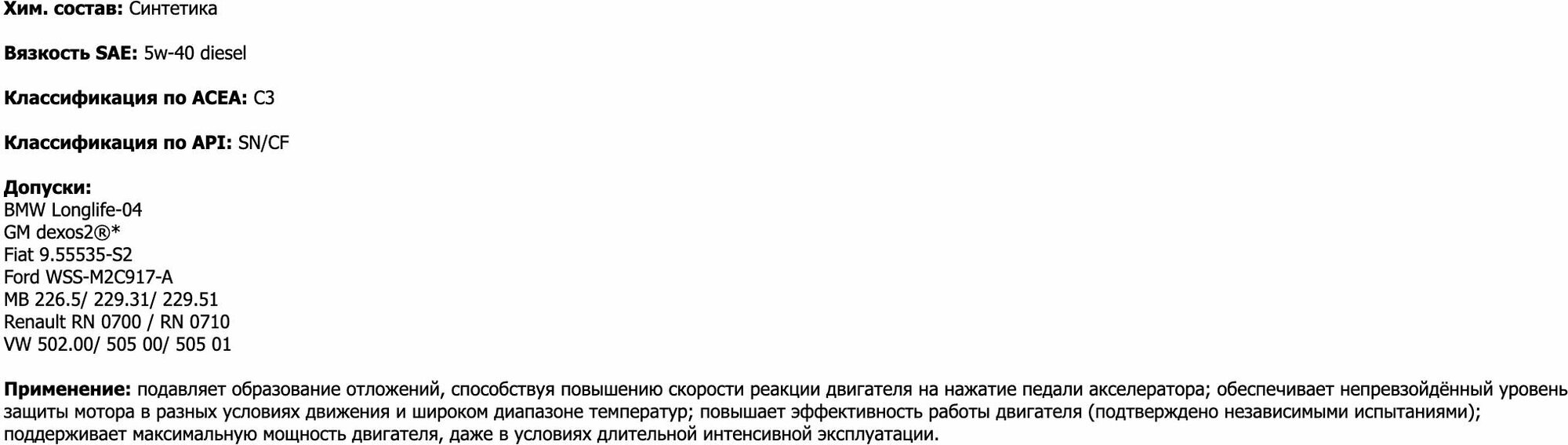Description: SAE viscosity grade: 5W-40, oil type: synthetic, vehicle type: passenger cars, fuel type: diesel, API standard: CF, SN, ACEA standard: A3/B3, C3, C3, OEM approvals: BMW Longlife-04, Ford WSS-M2C 917-A, GM Dexos 2, MB 226.5, MB 229.31, MB 229.51, VW 505.01