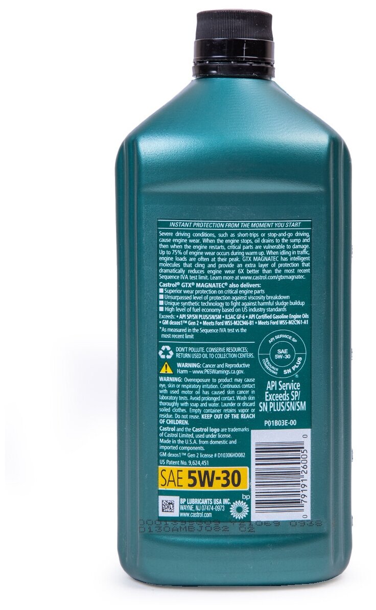 SAE viscosity grade: 5W-30, oil type: synthetic, vehicle type: passenger cars, fuel type: gasoline, API standard: SN, engine type: four-stroke