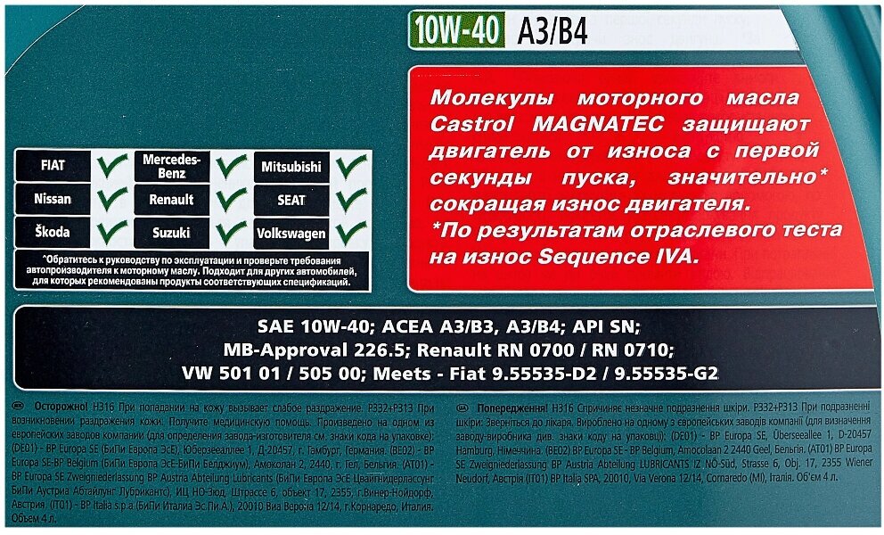 Description: SAE viscosity grade: 10W-40, oil type: semi-synthetic, synthetic, vehicle type: passenger cars, fuel type: gasoline, diesel, API standard: SL, SN, ACEA standard: A3/B4, A3/B3, A3/B3, A3/B4, OEM approvals: FIAT 9.55535-D2, FIAT 9.55535-G2, MB 226.5, MB 229