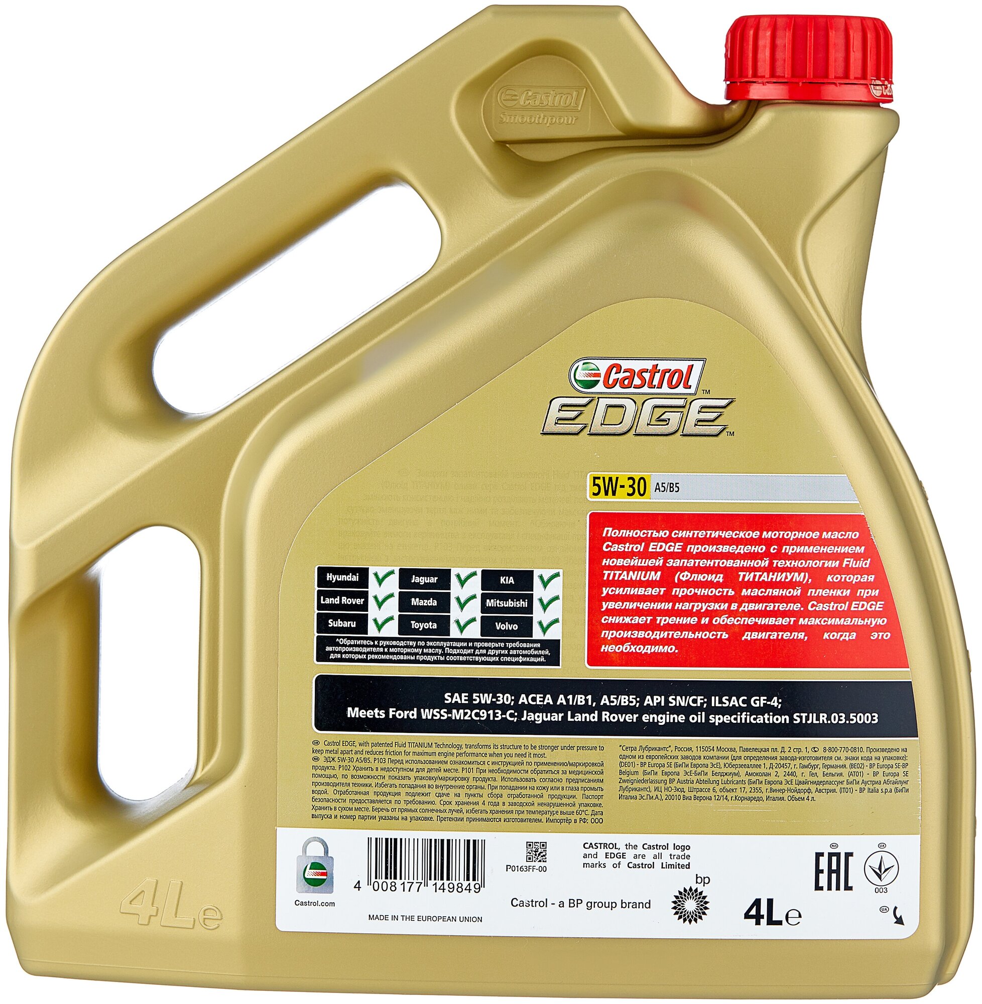 SAE viscosity grade: 5W-30, oil type: synthetic, vehicle type: passenger cars, fuel type: gasoline, diesel, API standard: CF, SN, ACEA standard: A1/B1, A3/B4, A5/B5, A1, A5, B1, B5, OEM approvals: Ford WSS-M2C 913-C, Ford WSS-M2C913-C, ILSAC GF-4, STJLR.0