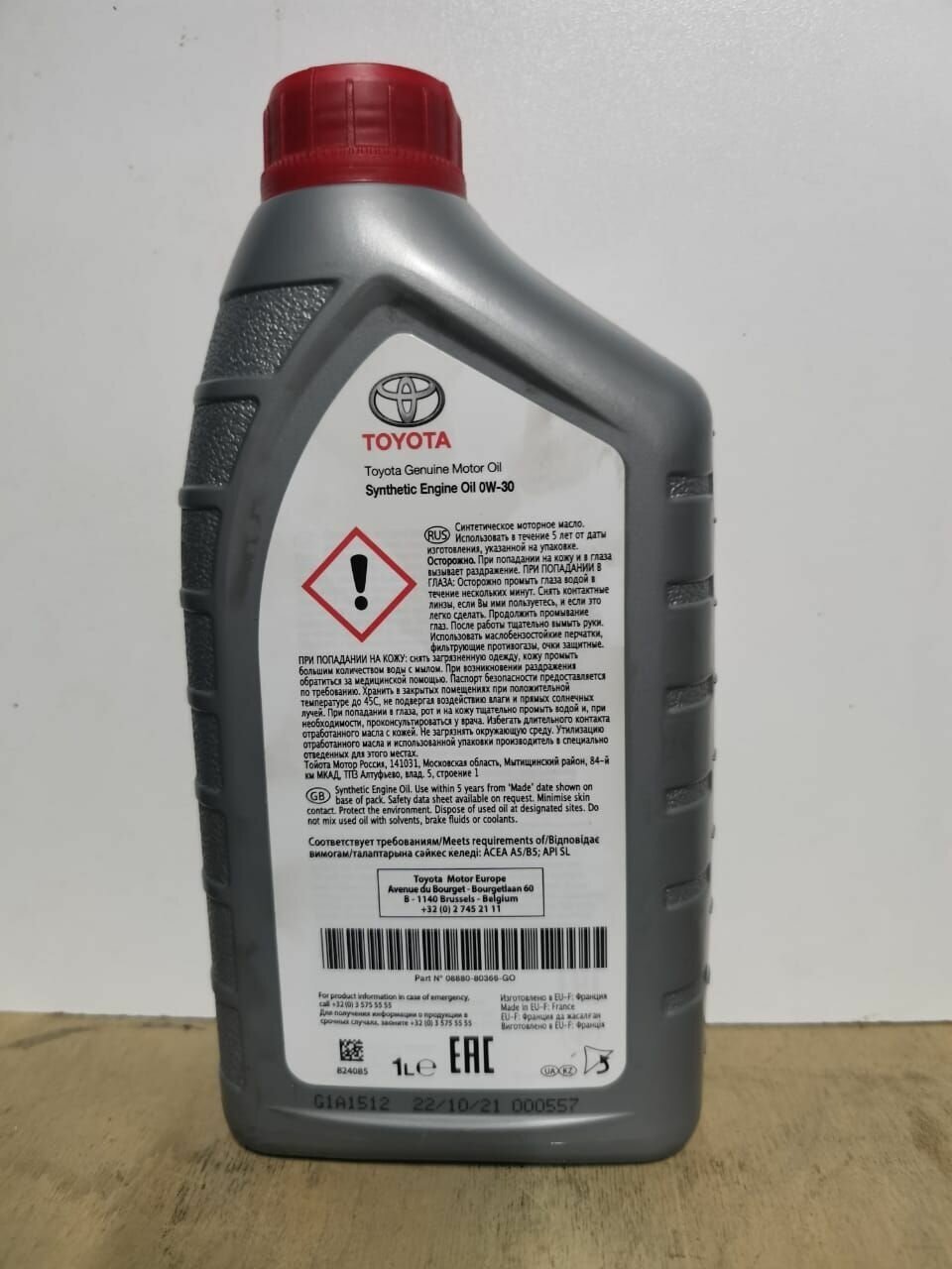 SAE viscosity grade: 0W-30, oil type: synthetic, fuel type: gasoline, diesel, methane, API standard: CF, SL, ACEA standard: A5/B5, A5/B5, OEM approvals: 08880-80365, Toyota, type engine: four stroke
