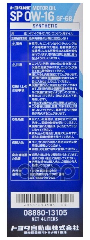 SAE viscosity grade: 0W-16, oil type: synthetic, vehicle type: passenger cars, fuel type: gasoline, API standard: SN, engine type: four-stroke