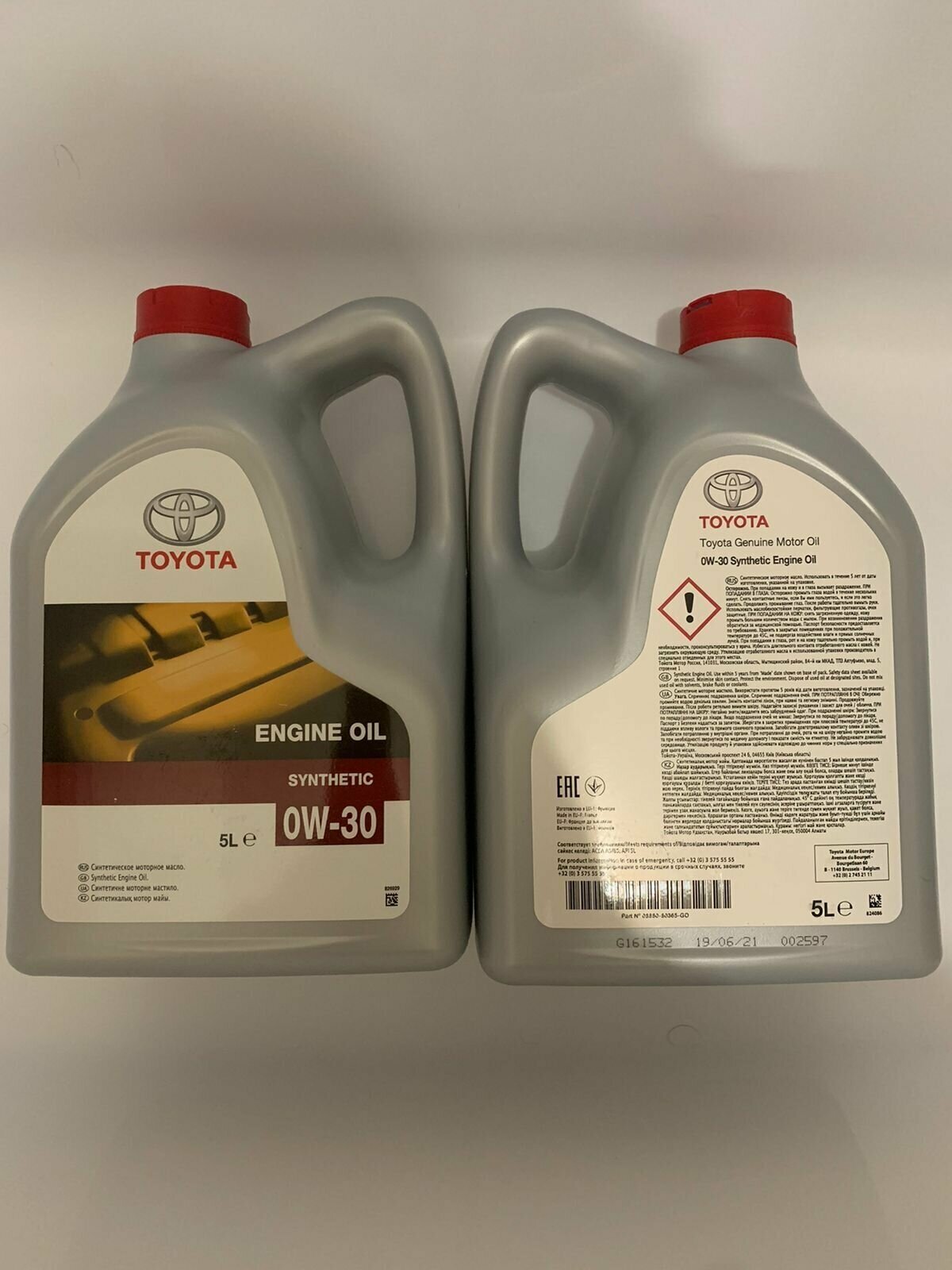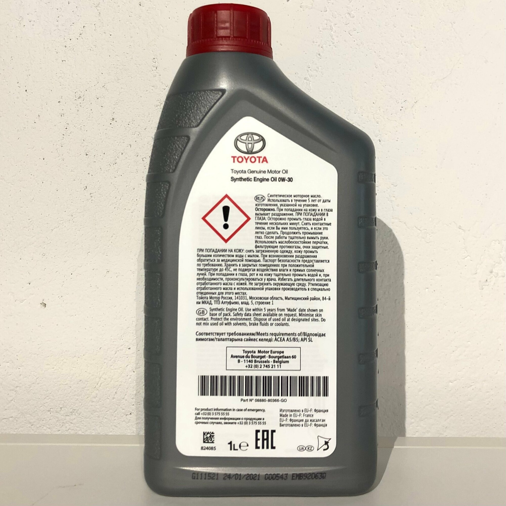 SAE viscosity grade: 0W-30, oil type: synthetic, fuel type: gasoline, diesel, methane, API standard: CF, SL, ACEA standard: A5/B5, A5/B5, OEM approvals: 08880-80365, Toyota, type engine: four stroke