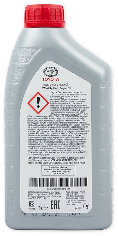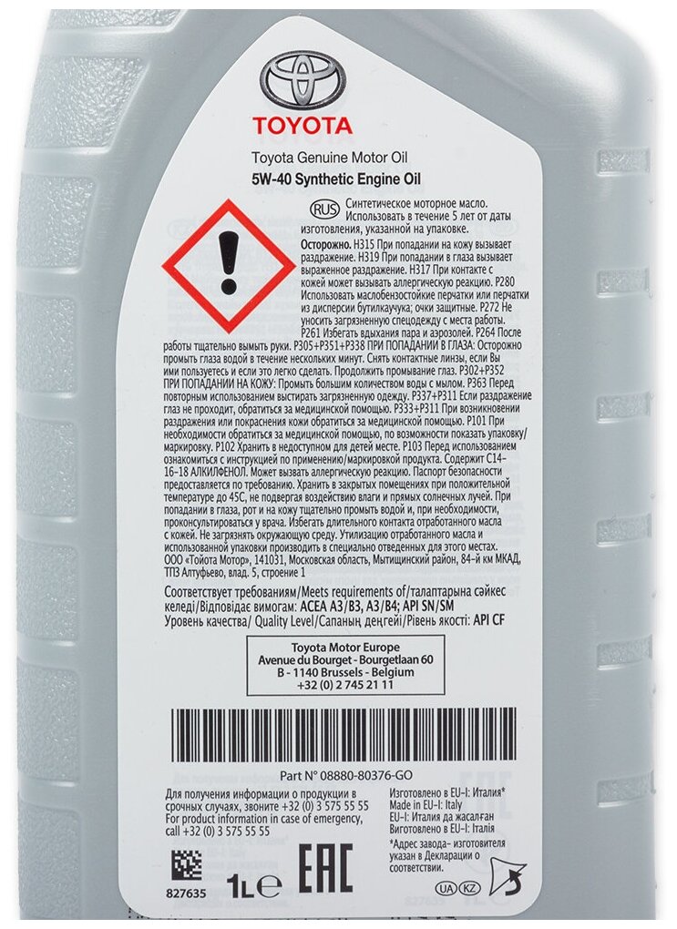 SAE viscosity grade: 5W-40, oil type: synthetic, vehicle type: passenger cars, fuel type: gasoline, diesel, API standard: CF, SL, ACEA standard: B3 / B4 / A3, OEM approvals: TOYOTA, engine type: four-stroke