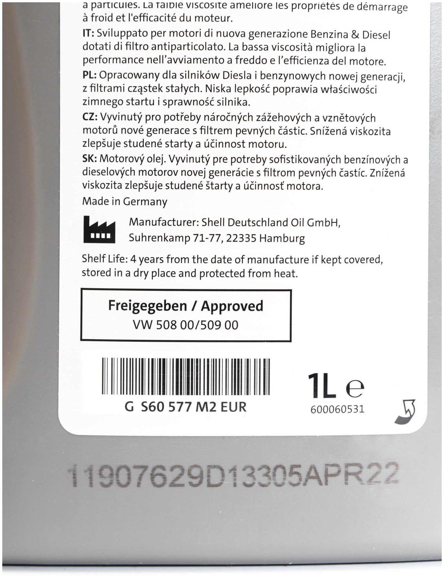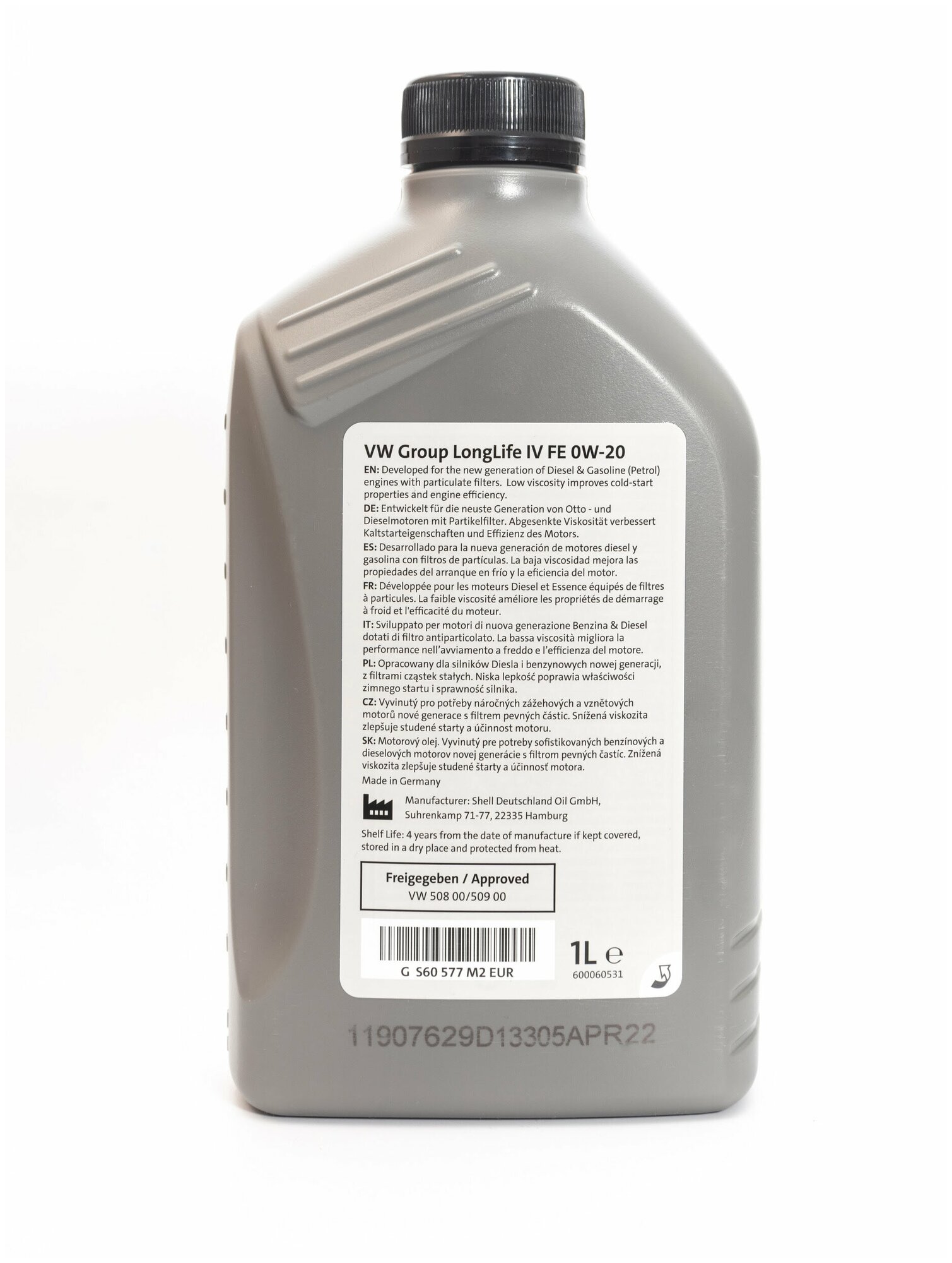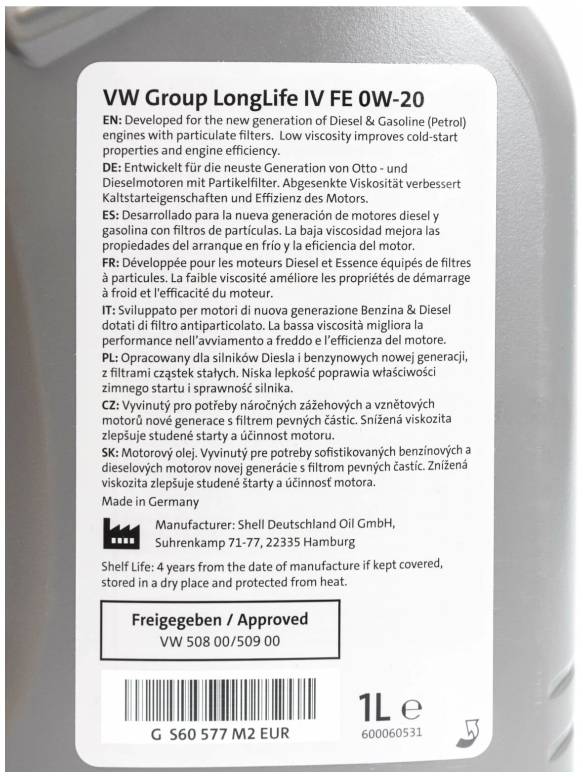 SAE viscosity grade: 0W-20, oil type: synthetic, fuel type: gasoline, diesel, API standard: SN, SN+, ACEA standard: C5, OEM approvals: VW 508.00, VW 509.00, engine type: four-stroke, for turbocharged engines