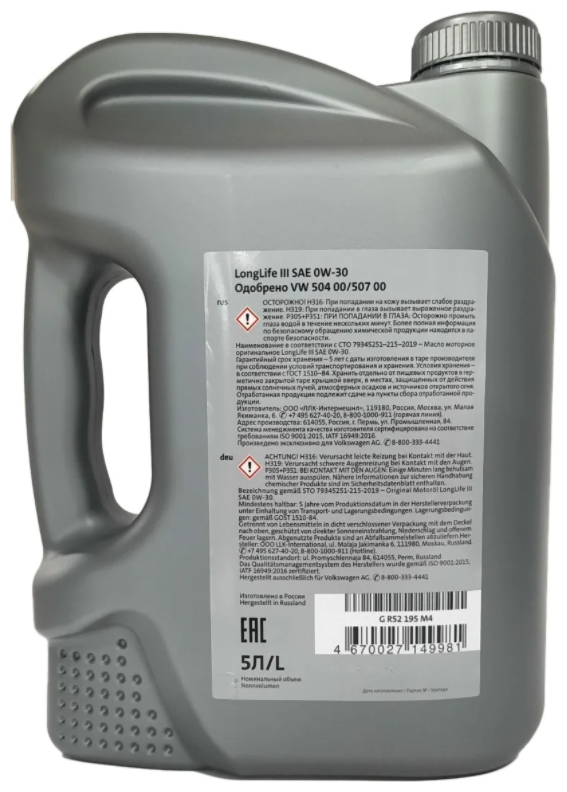SAE viscosity grade: 0W-30, oil type: synthetic