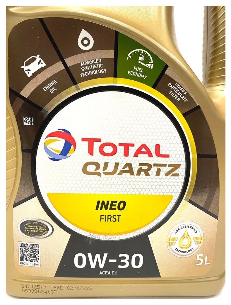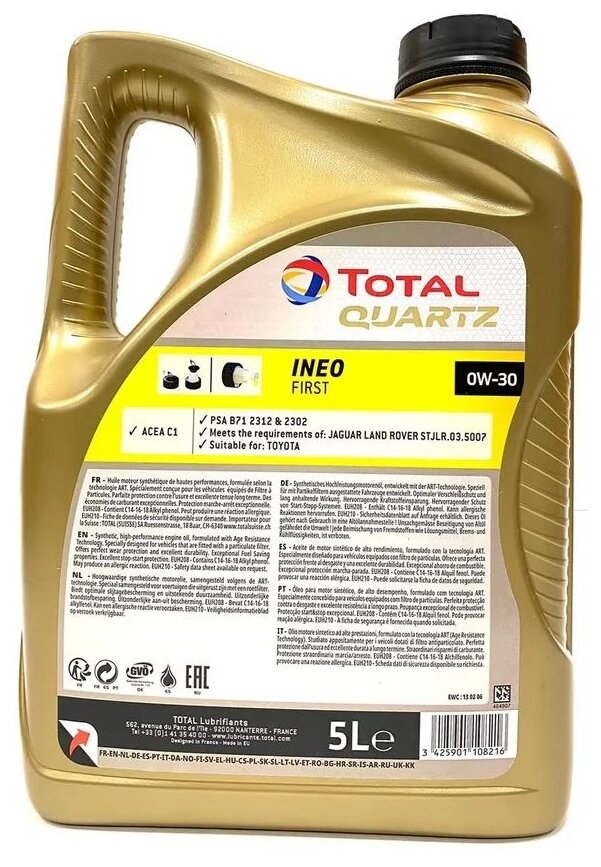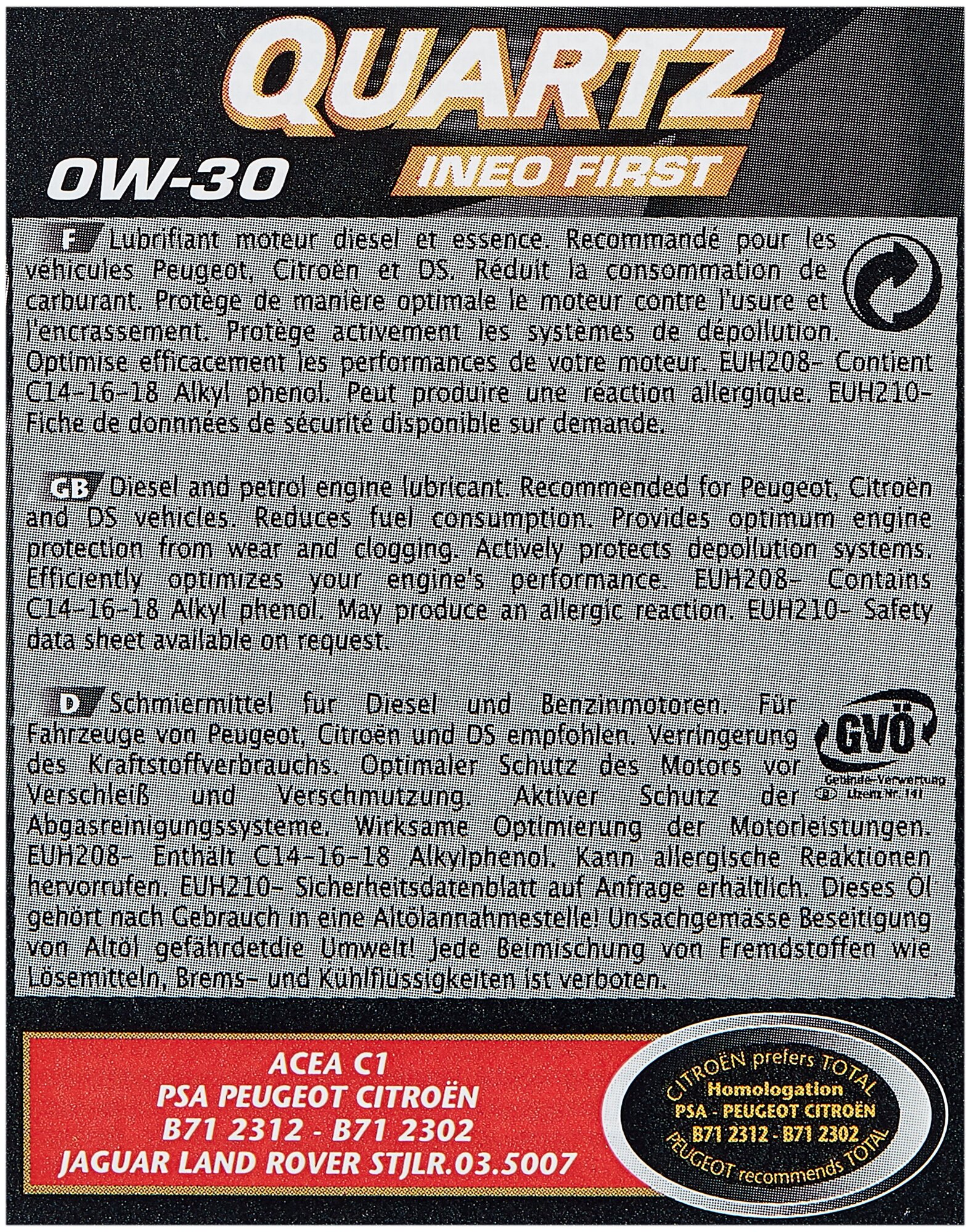 SAE viscosity grade: 0W-30, oil type: semi-synthetic, synthetic, vehicle type: passenger cars, fuel type: gasoline, diesel, Gas, API standard: CF, SL, ACEA standard: C1, C2, C2, OEM approvals: Land Rover - ST JLR.03.5007, PSA B71 2302, PSA B71 2312, STJL