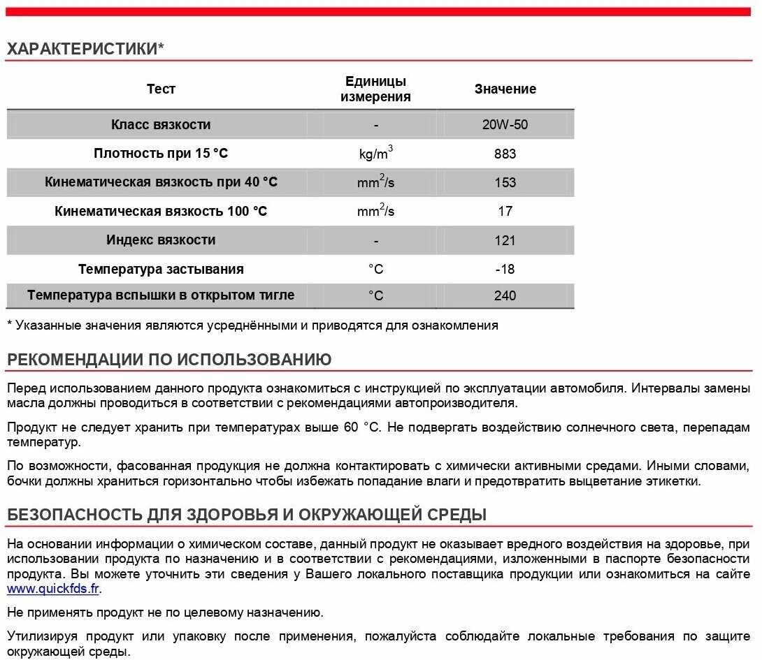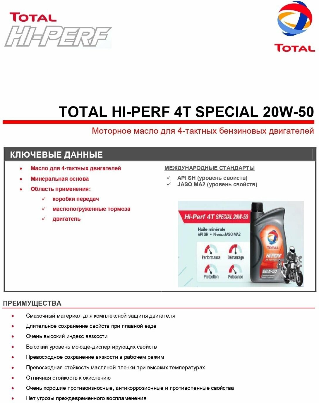 SAE viscosity grade: 20W-50, oil type: mineral, vehicle type: motorcycle, fuel type: gasoline, API standard: SH, engine type: four-stroke