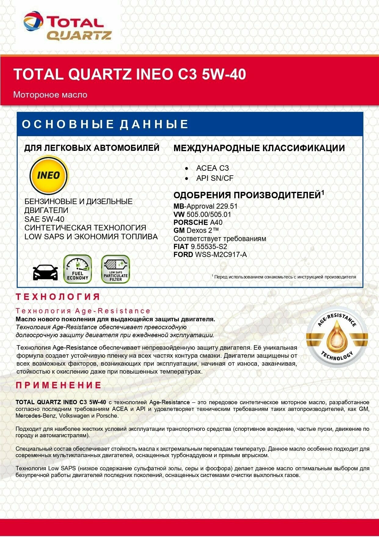 SAE viscosity grade: 5W-40, oil type: synthetic, fuel type: gasoline, diesel, API standard: CF, SN, ACEA standard: C3, OEM approvals: FIAT 9.55535-GH2, FIAT 9.55535-S2, Ford WSS-M2C 917 -A, GM Dexos 2, MB 229.51, Opel GM Dexos 2, Opel OV0401547, PORSCHE A