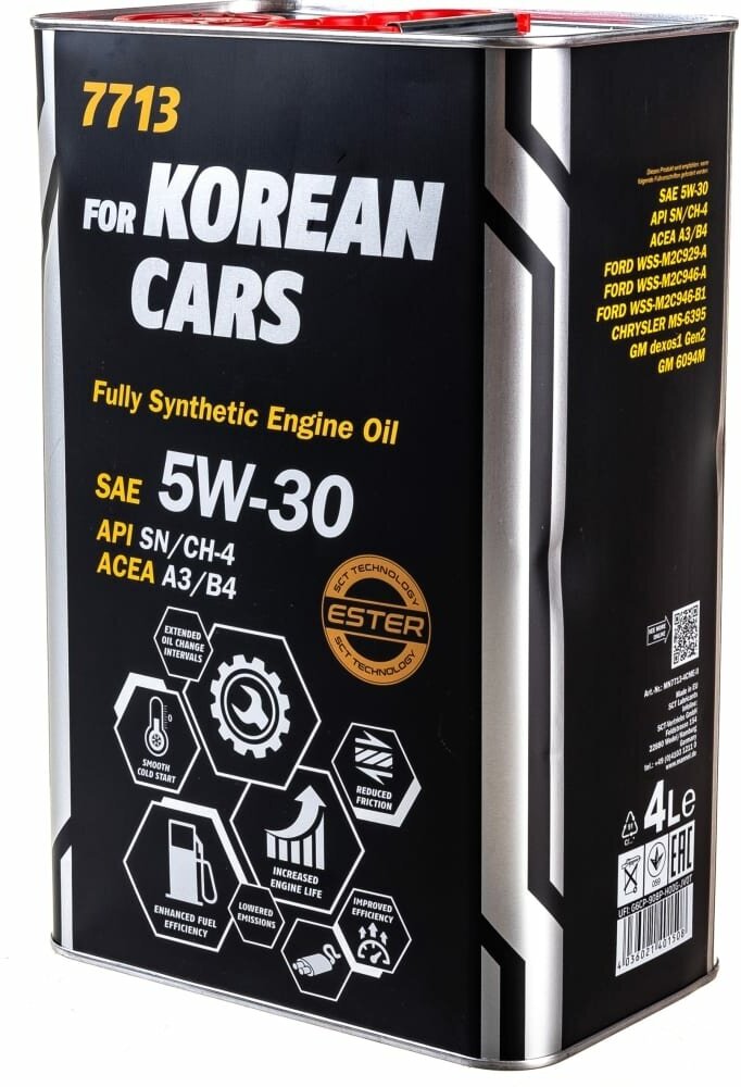 Description: SAE viscosity grade: 5W-30, oil type: semi-synthetic, synthetic, vehicle type: passenger cars, fuel type: gasoline, diesel, API standard: CH-4, SL, SM, SN, CH-4SN, ACEA standard: A3/ B4, A3/B4, OEM approvals: Chrysler MS-6395, GM 6094M, GM Dexos 1, GM Dex