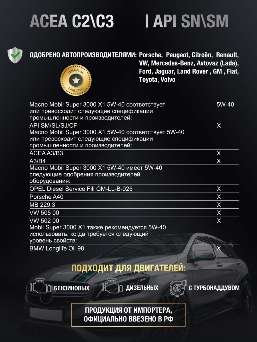 Description: SAE viscosity grade: 5W-40, oil type: semi-synthetic, synthetic, Synthetic, vehicle type: passenger cars, fuel type: gasoline, diesel, methane, propane, diesel, gasoline, API standard: CF, CF-4, SF, SJ , SL, SM, SN, API SN,SM,SL SJ, CF/SJ