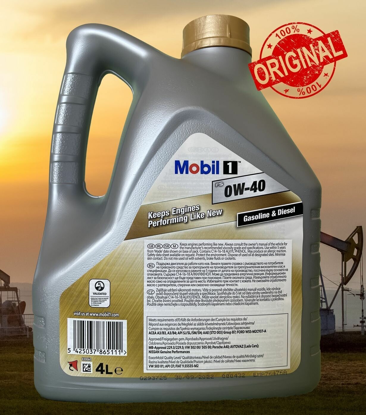 SAE viscosity grade: 0W-40, oil type: synthetic, fuel type: gasoline, diesel, methane, API standard: CF, SJ, SL, SM, SN, ACEA standard: A3/B4, A3, B3, B4, OEM approvals : MB 229.3, MB 229.5, PORSCHE A40, VW 502 00, engine type: four-stroke
