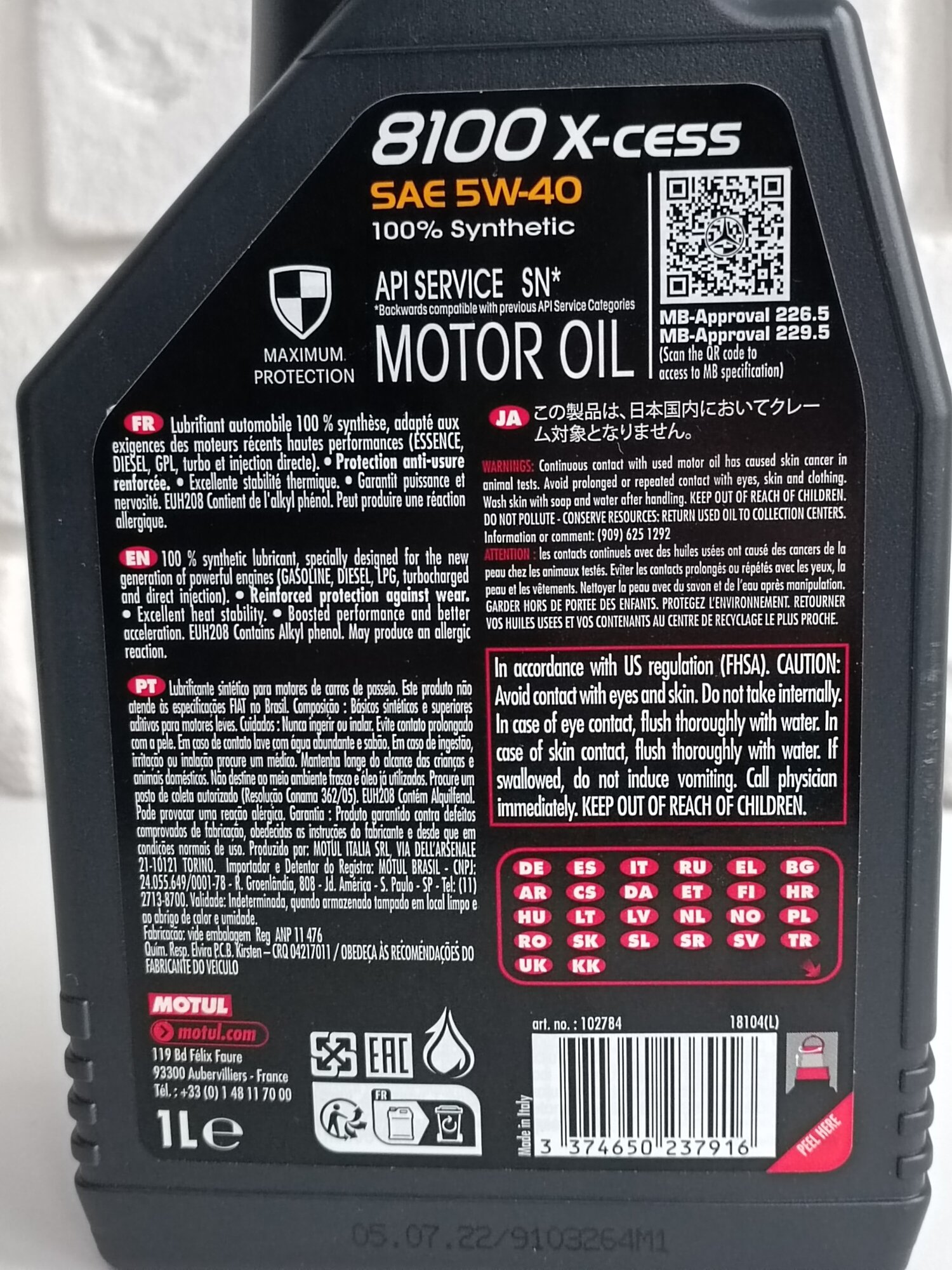 SAE viscosity grade: 5W-40, oil type: semi-synthetic, synthetic, Synthetic, Synthetic base oils, vehicle type: passenger cars, fuel type: gasoline, diesel, methane, Gas, API standard: CF, SN, ACEA standard: A3/ B4, A3