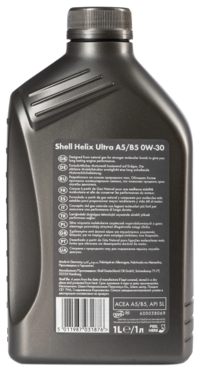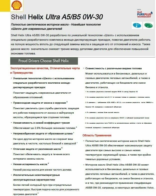 SAE viscosity grade: 0W-30, oil type: synthetic, vehicle type: passenger cars, fuel type: gasoline, diesel, methane, API standard: SL, ACEA standard: A5/B5, engine type: four-stroke, for turbocharged engines
