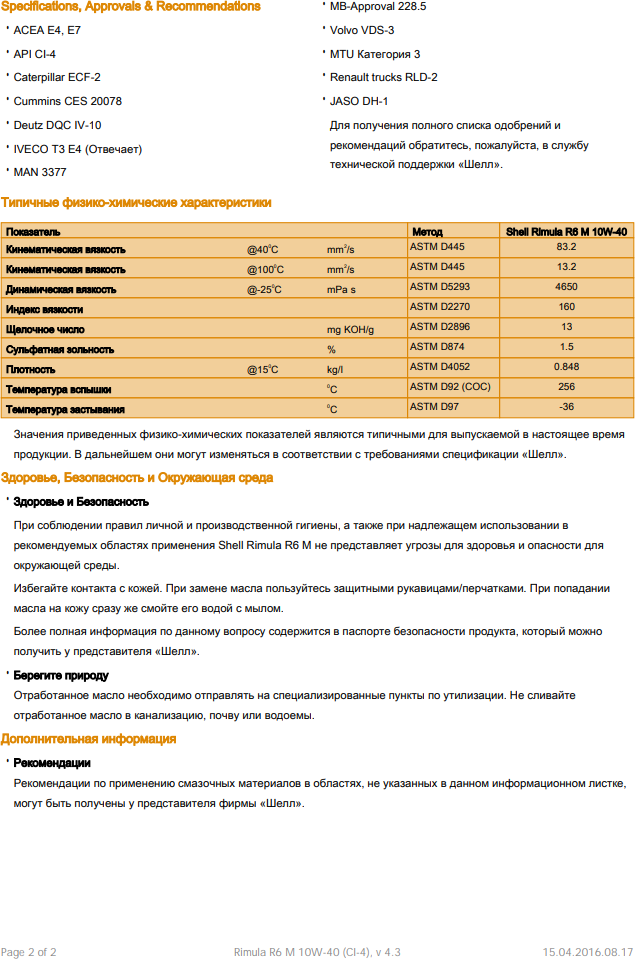 Caterpillar ECF-2, Cummins CES 20078, Deutz DQC IV-10, Iveco, MAN M3377, MB 228.5, MTU Typ 3, Renault RLD-2, Volvo VDS-3, Iveco T3 E4, JASO DH-1, MAN 3377